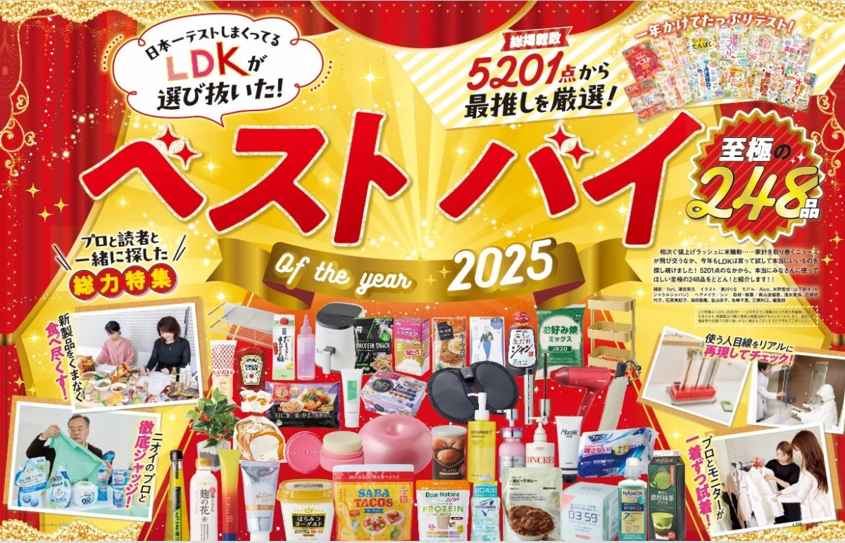 そんな中で、消費者の強い味方となるのが、テストする女性誌『LDK』です。広告やタイアップを一切行わず、編集部と専門家が“使う人目線”で製品を徹底検証するその姿勢は、多くの読者から厚い信頼を寄せられています。2025年11月28日に発売された『LDK』2026年1月号では、一年間かけてテストした総掲載数5201点の中から、「今年のベスト2025」として至極の248品が発表されました。